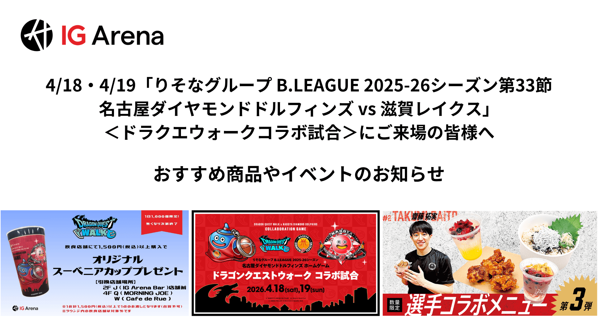 4/18・4/19「りそなグループ B.LEAGUE 2025-26シーズン第33節 名古屋ダイヤモンドドルフィンズ vs 滋賀レイクス」 <ドラクエウォークコラボ試合>にご来場の皆様へ